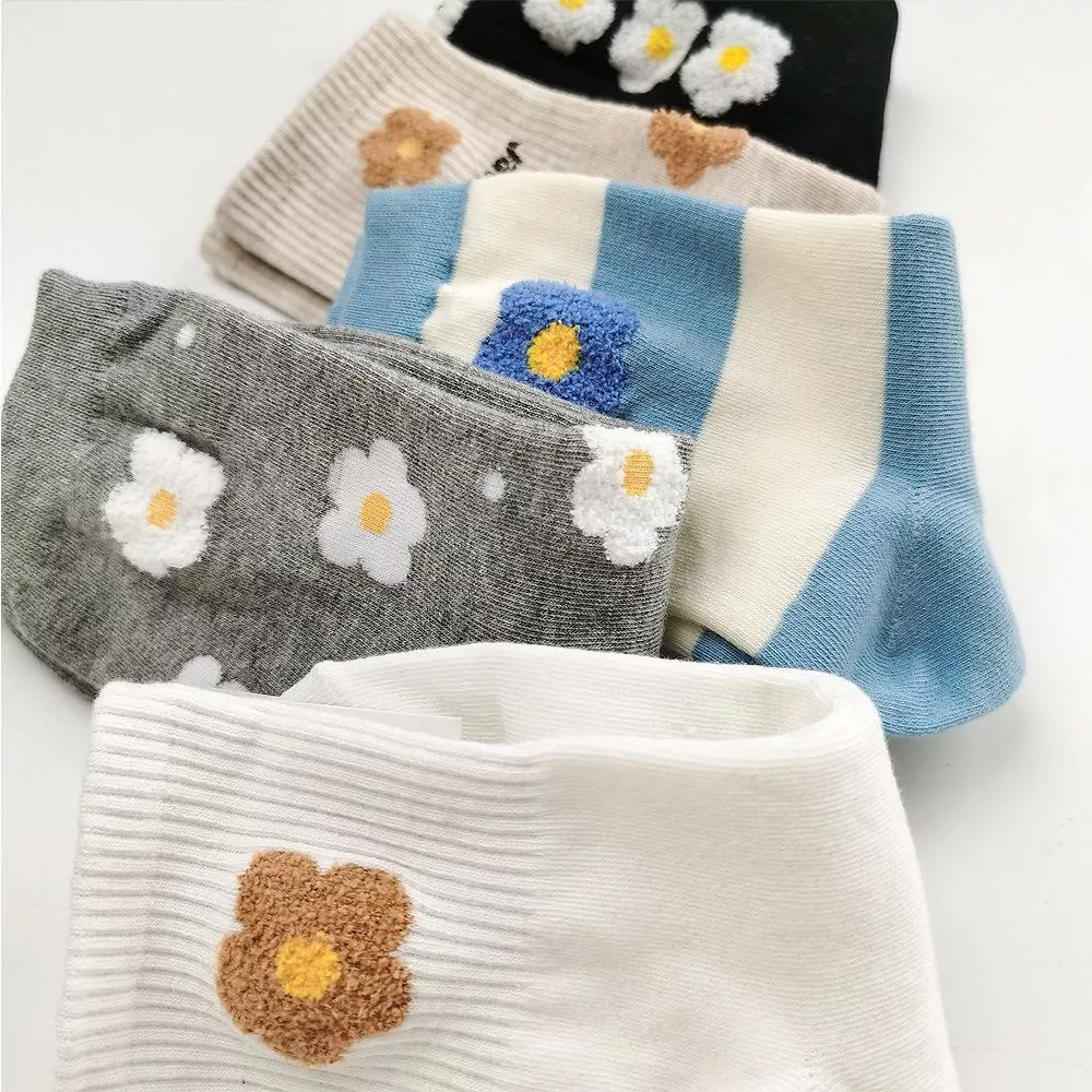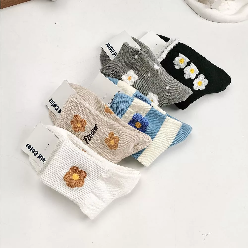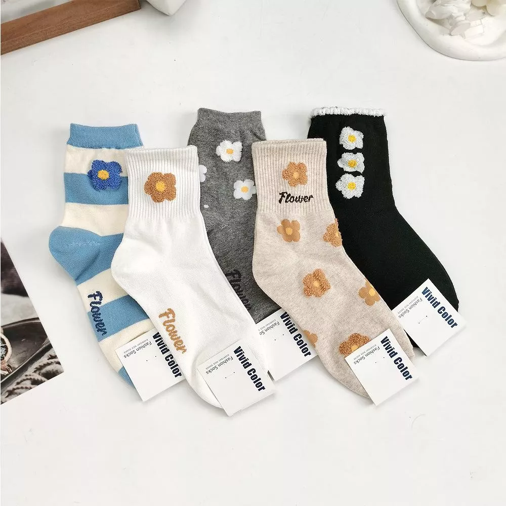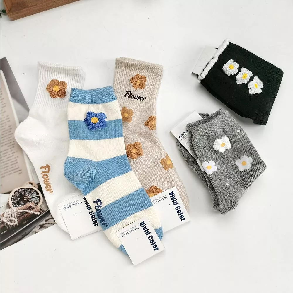 韓國襪子 毛絨花朵中筒襪